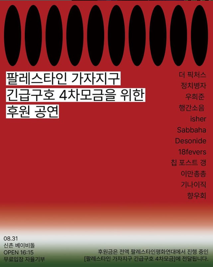 8월 31일, 신촌 베이비돌에서 팔레스타인평화연대BDS Korea @pps_kor 에서 진행하고 계신 ‘팔레스타인 가자지구 긴급구호 4차모금’에 후원금을 보태기 위한 후원 공연을 개최합니다. 칩 포스트 갱을 포함한 12팀의 음악인들이 감사하게도 뜻을 함께 해 주셨습니다.